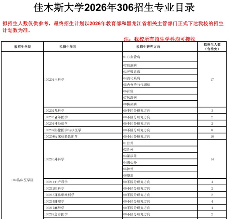 佳木斯大学2026年临床医学硕士研究生招生明细